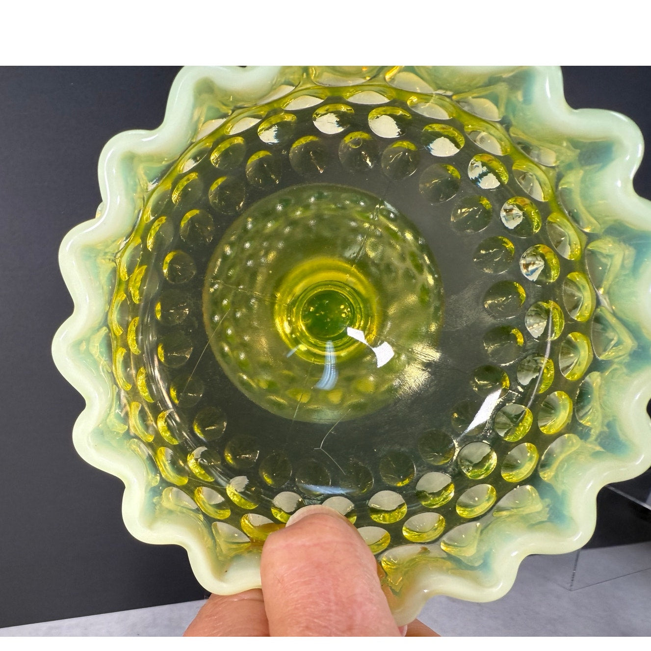 Fenton uranium glass footed hobnail candy dish in topaz opalescent (Vaseline) color. Perfect for candies, trinkets, or display, with the... Read more