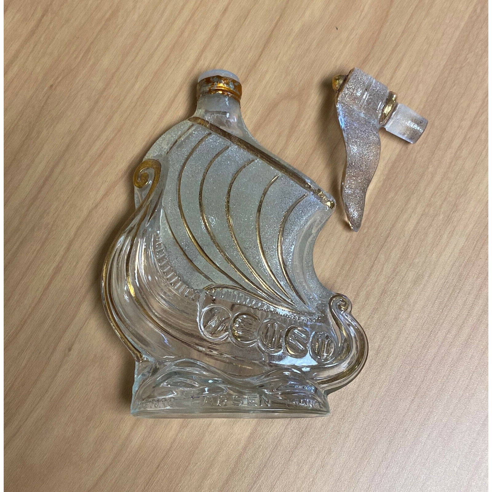 Brand: LarsenOrigin: FranceEra: 1960sType: Cognac Bottle / DecanterMaterial: Frosted glass with gold trimCapacity: 1/10 PintFeatures: Original stopper; ship design; original... Read more