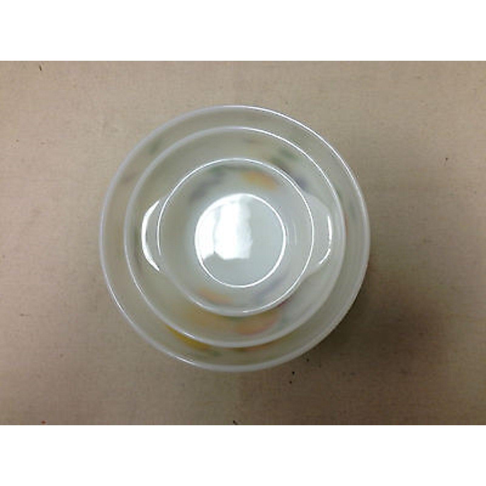 Brand: Fire King / Anchor HockingPattern: FruitPieces: 3 nesting bowlsSizes: 5 3/4", 7 1/4", and 8 3/4"Capacity: Smallest approx. 1... Read more