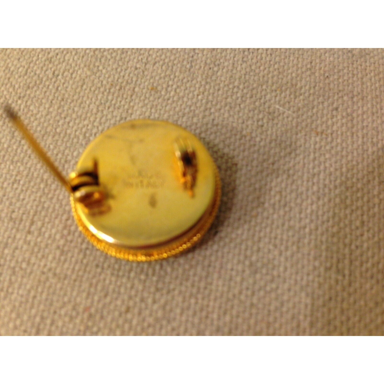 Origin: ItalyMaterial: Micro mosaic, gold-tone accentsType: Pin / BroochShape: Round, floral designEra: 1930s-1940sCondition: Excellent, very light discoloration on backMarkings: “Italy”... Read more