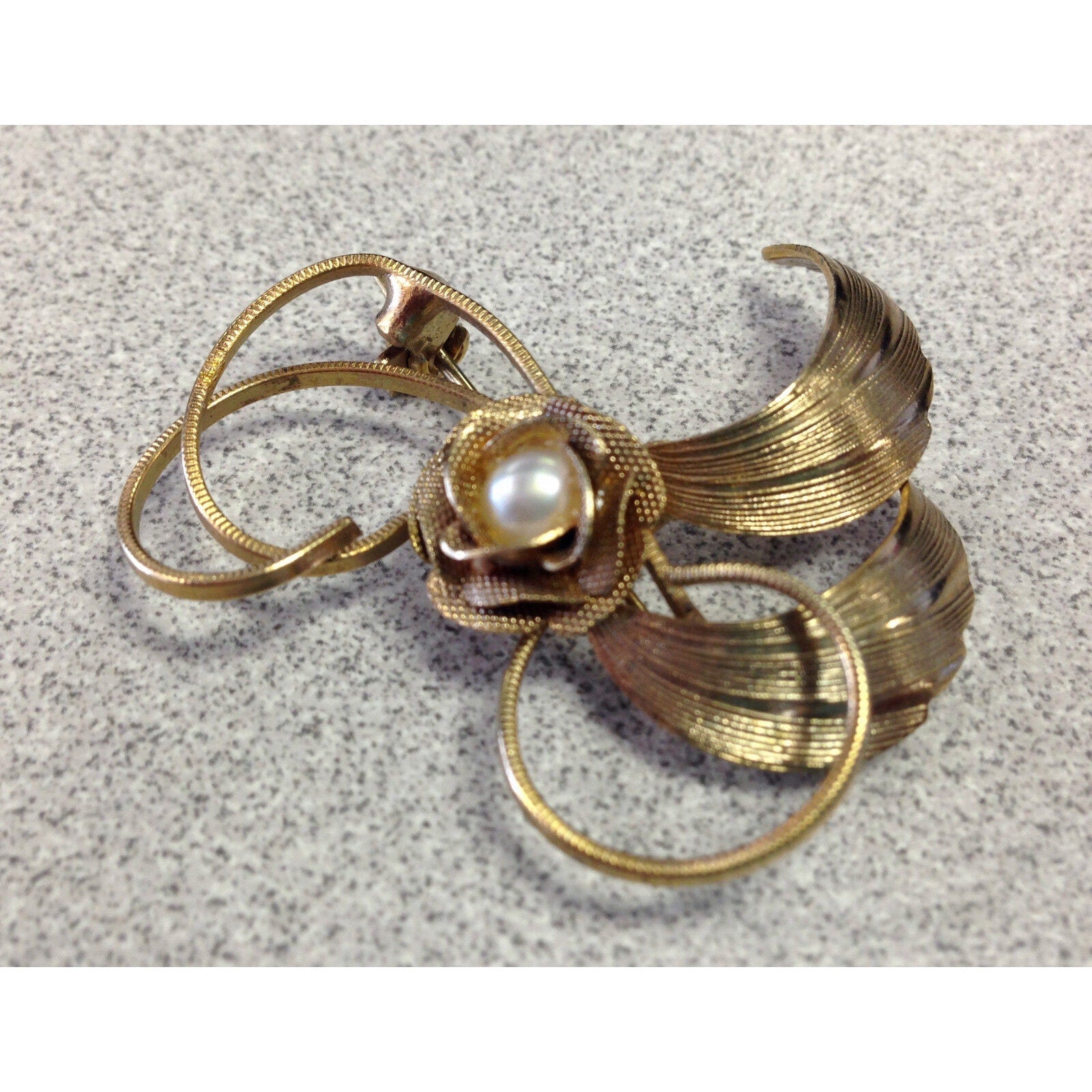 Vintage Retro Swirl Gold Tone and Faux Pearl Pin – Brooch / Pendant